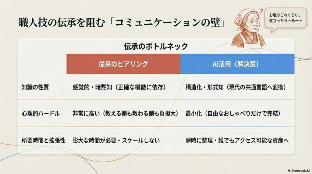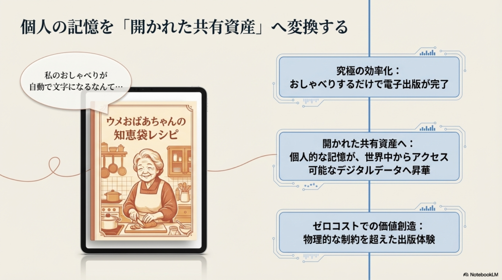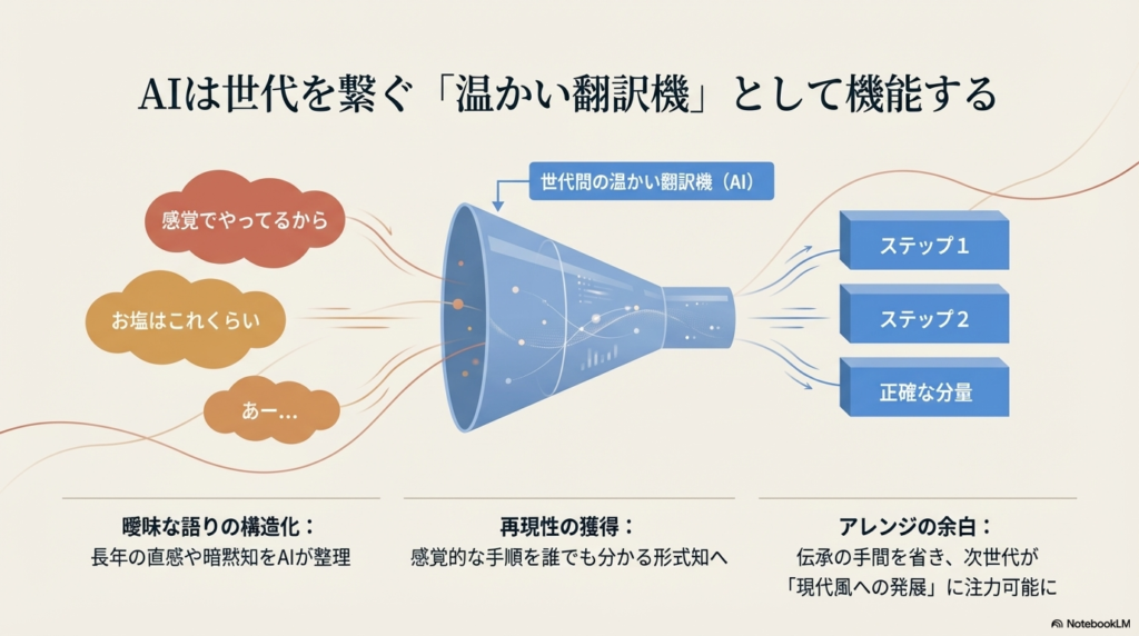 AIを活用すれば、曖昧あいまいな言葉や手順が構造化され、誰でも再現できる「形式知」に変換できます。これは単なる記録作業ではありません。個人の頭の中にしかなかった知恵をオープンソース化し、多世代がアクセスできる「開かれた共有資産」に昇華させる創造的なプロセスです。