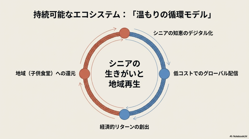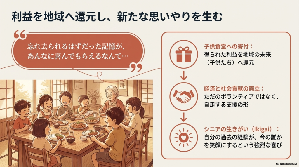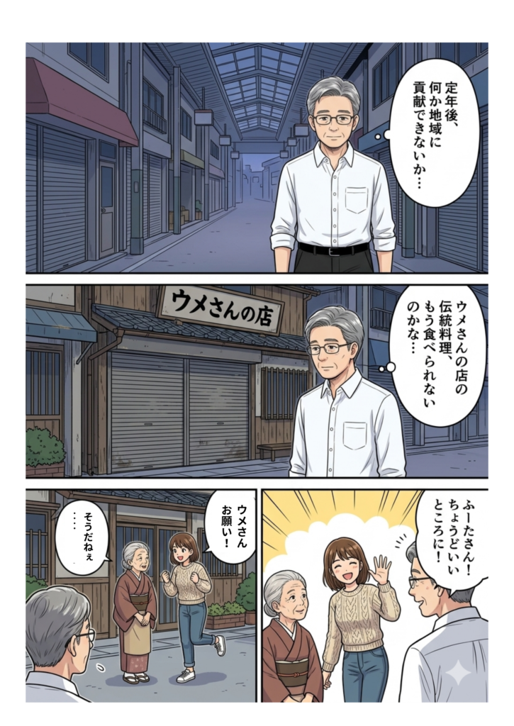 マンガでは、得られた利益を子供食堂へ還元し、それがシニアの生きがいを生むという循環モデルを描きました。善意だけの活動は疲弊しやすいもの。収益化が組み込まれることで支援は持続可能になります。経済活動と社会貢献の両立こそが、生涯現役を支える強力な土台です。