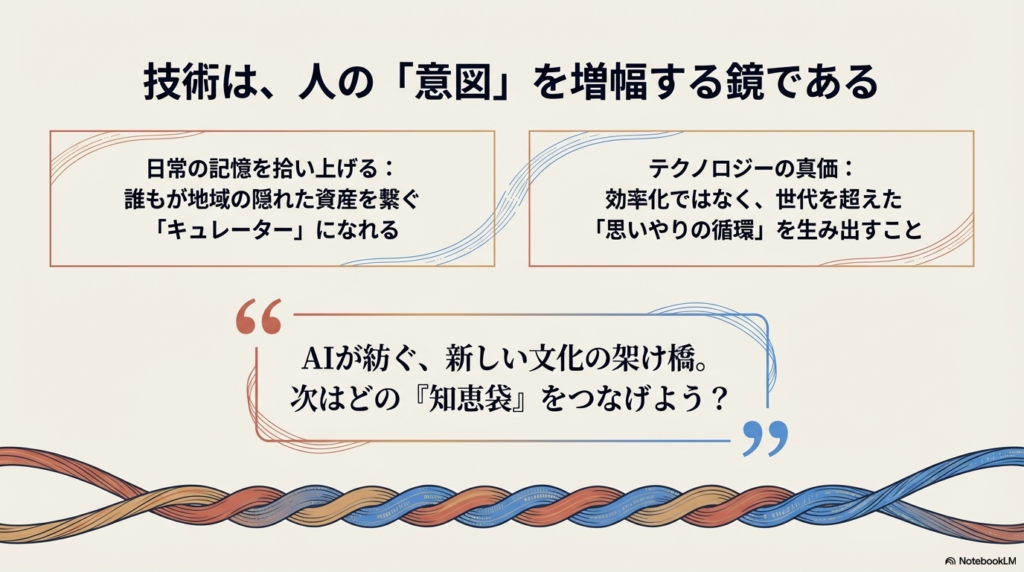 本当の成功は技術による効率化ではなく、AIを通じて世代が繋がり、地域に思いやりの循環が生まれること。AIは使う人の「意図」を増幅させます。シニアが「誰かを笑顔にしたい」と願えば、テクノロジーは人を温めるものになります。