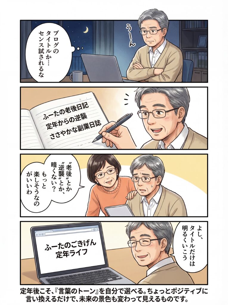 この漫画の主人公・ふーたはブログのタイトルをつけるにあたって、最初は「老後日記」「逆襲」「副業」…と力が入りました。