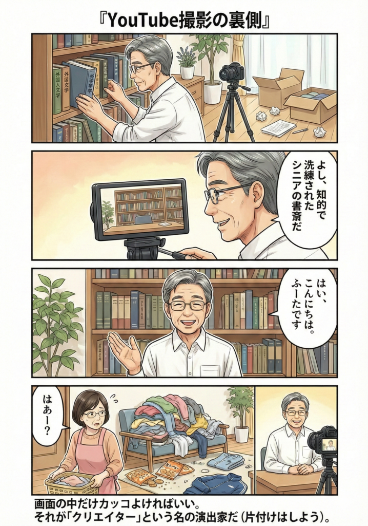 このマンガのように、「画面の中だけ立派な書斎」を作って悦に入る。これ、笑い話のようでいて、実はYouTuberあるあるですよね。