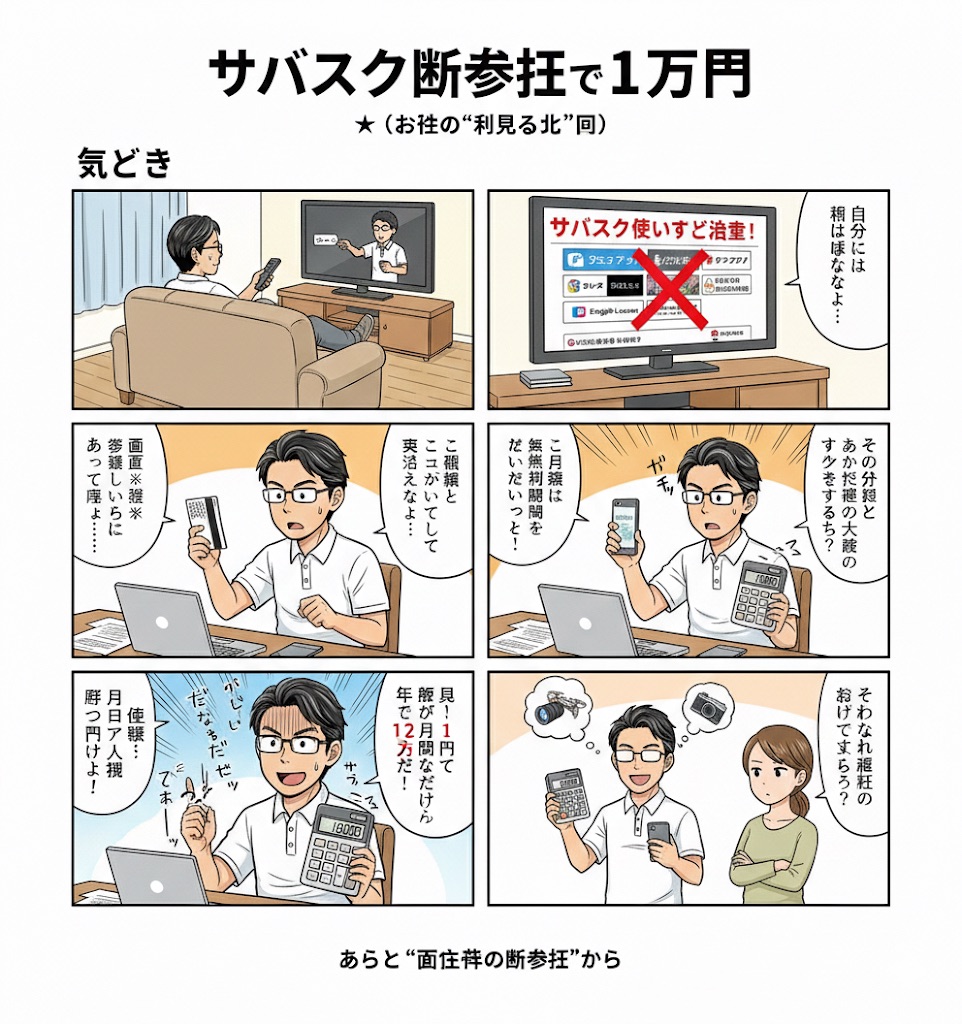 ホントのタイトルは「サブスク断捨離で1万円」(お金の〝見える〟化)。