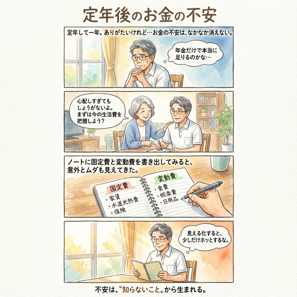 - ChatGPTに「〝定年後のお金の不安〟をテーマにした4コママンガのストーリーを考えて」と指示→ChatGPTが構成やコマごとのセリフを提案